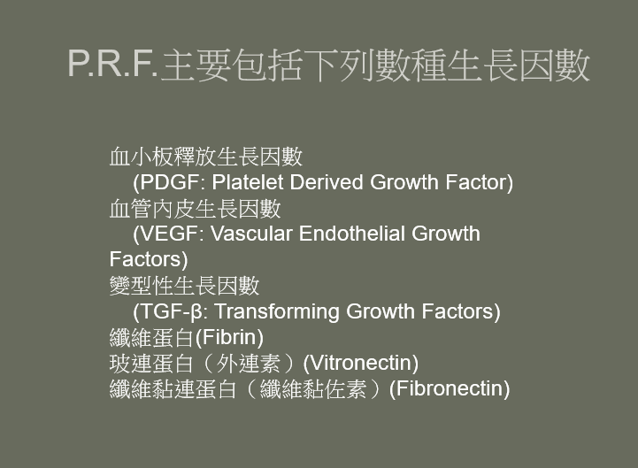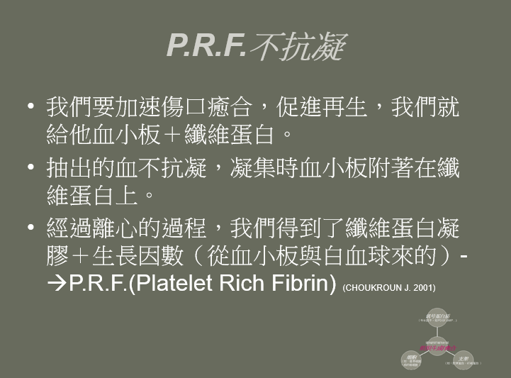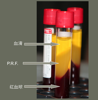 Platelet-Rich Fibrin (P.R.F.) 富含血小板之纖維凝膠 ,法國 Dr. Joseph Choukroun,2001年提出。