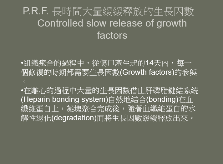 也就是手術過程加上PRF是為了加速傷口癒合!!同一原理,在植牙手術中若需補骨,我們也會把PRF與骨粉混和,骨粉只是原料,加上PRF加速這個原料的運用,減少失敗的機會。